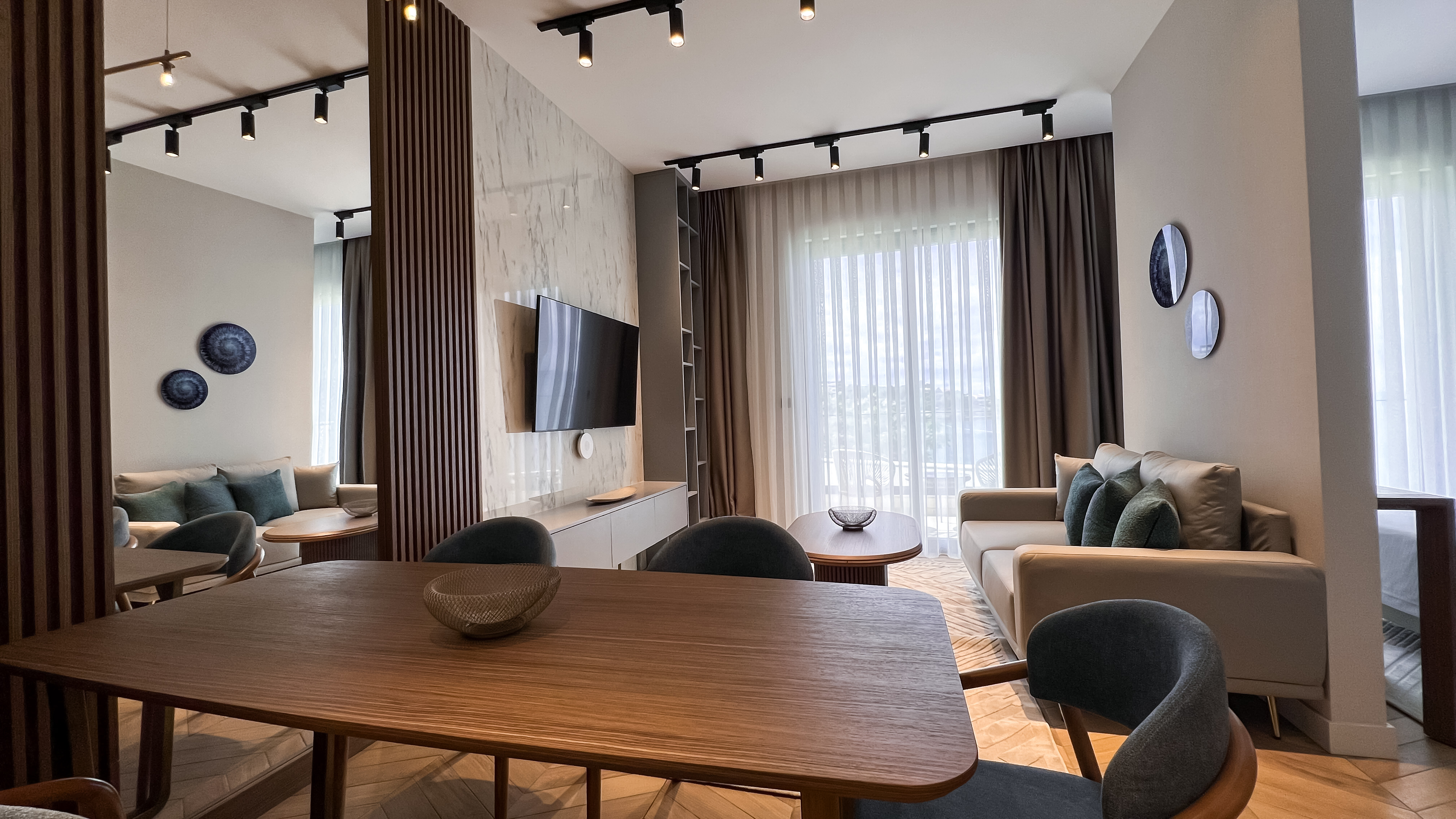 For guests who want to stay awhile. The Deluxe Suite offers a separate living and sleeping area, an elegant kitchen, and a private terrace with a sea view. The interior is quiet and sophisticated — designed to go unnoticed, yet everything functions perfectly.